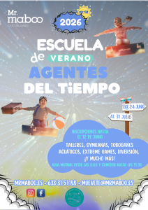 En Mr.maboo os presentamos nuestra Escuela de Verano 2026: ¡Agentes del Tiempo!, donde nuestros jóvenes aventurer@s vivirán desde el 24 de junio al 31 de julio unas semanas llenas de experiencias deportivas, educativas y lúdicas, en un ambiente dinámico, seguro y cooperativo.